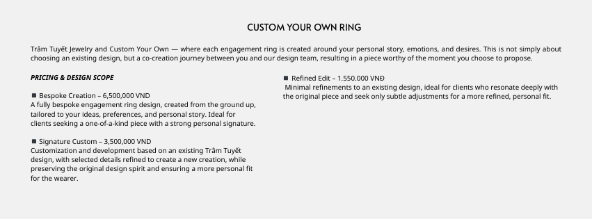Mỗi thiết kế nhẫn cầu hôn, nhẫn kỷ niệm cưới đều bắt đầu từ sự đầu tư nghiêm túc vào ý tưởng, bố cục và câu chuyện bên trong chiếc nhẫn. Tiếp nối là quá trình tuyển chọn đá quý tự nhiên chất lượng cao, cùng vàng nguyên khối. Nhiều công đoạn phải chế tác hoàn toàn thủ công.